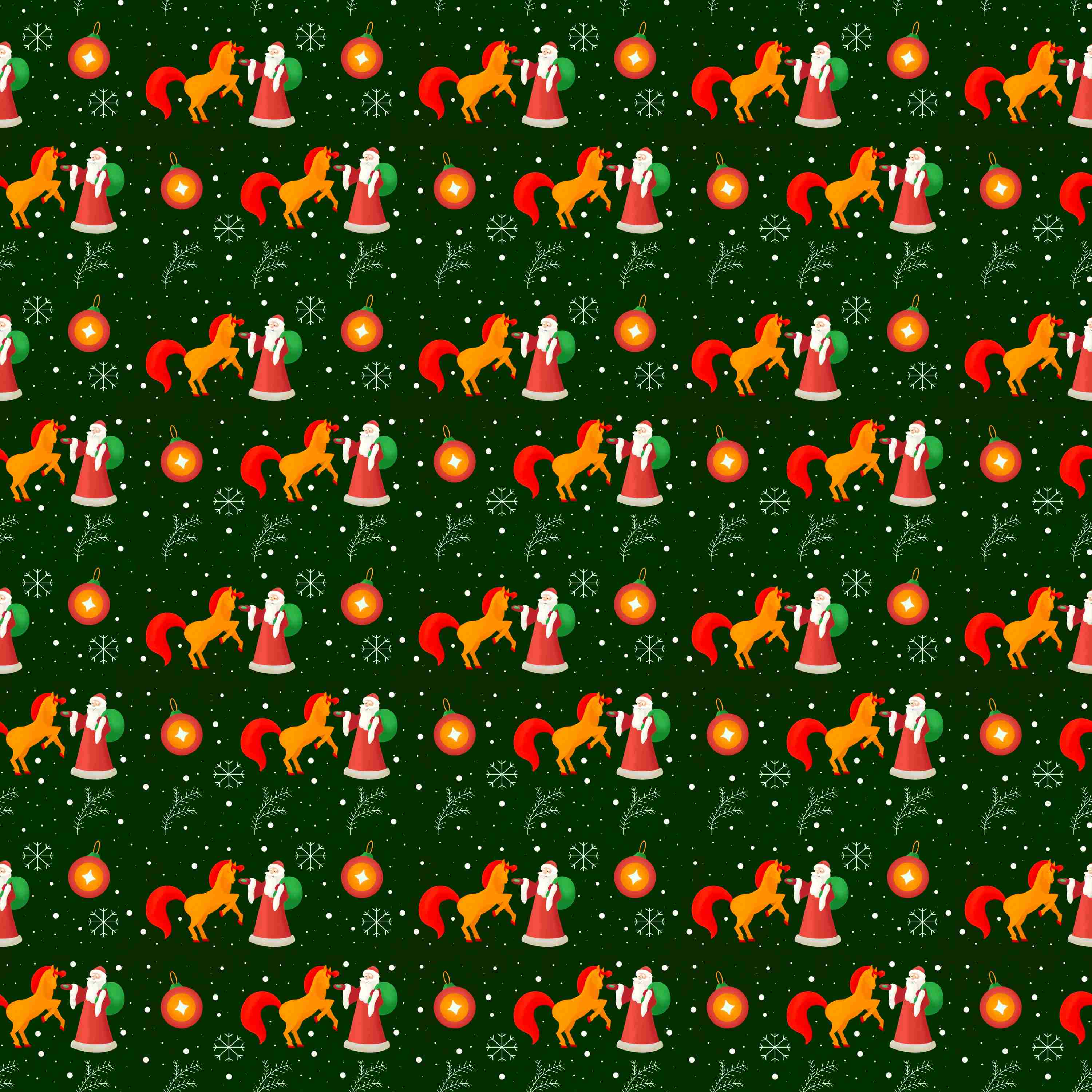 Авторский праздничный паттерн с новогодней лошадкой — символом 2026 года — и Дедом Морозом. Подойдёт для создания атмосферных новогодних дизайнов, упаковки, полиграфии и сувенирной продукции. Яркий, детализированный рисунок хорошо смотрится как в цифровом, так и в печатном виде. Характеристики файла:
